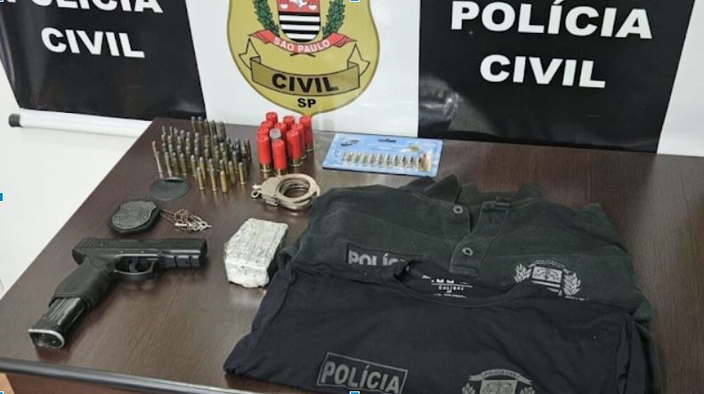 No local, os policiais localizaram diversas munições — incluindo calibres restritos — além de um distintivo, algemas e camisetas da Polícia Civil. Também foram apreendidos aproximadamente 160 gramas de maconha e um simulacro de arma de fogo encontrado dentro do veículo do suspeito.